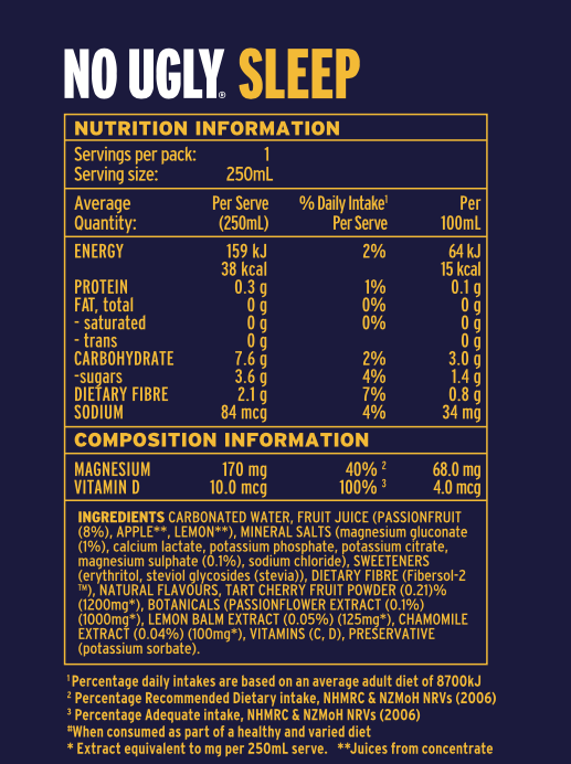 No Ugly Sleep is full of natural ingredients such as Magnesium, Tart Cherry, Passionflower, Chamomile and Lemon Balm. We've made it out of real passionfruit to give you a delicious liquid dessert. Enjoy 30 minutes before bedtime.